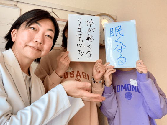 施術を受けた後の表情は、とてもリラックスしていました。お二人からは「自分たちで楽しみを作って、過ごしたい。」「こちらの対応を少し変えて人と向き合っていく。」と、前向きなコメントもうかがうことが出来ました。